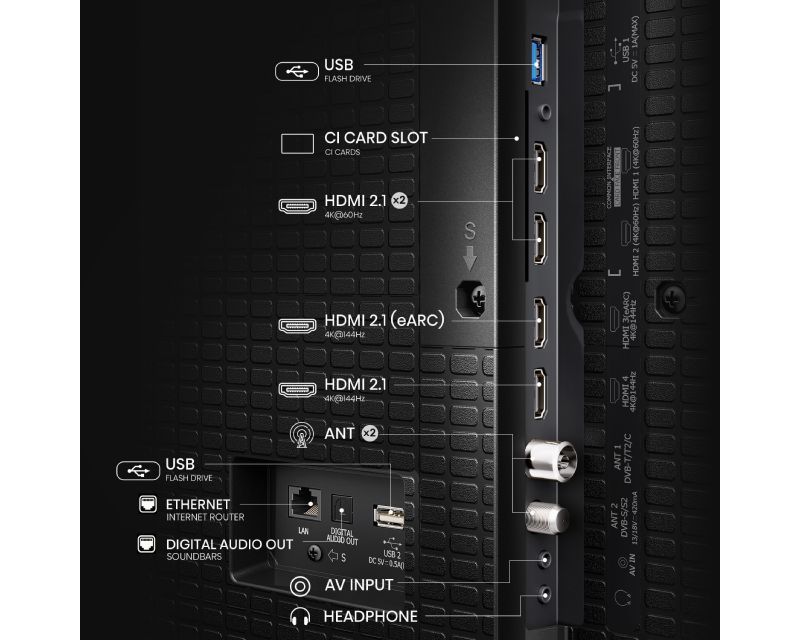 | Ostali priključci/Slotovi | RJ-45 (Ethernet LAN), CI +, HDMI 2.1 sa eARC, VRR i ALLM, Senzor svetla |