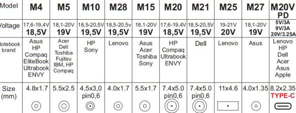 M5 18,1-20V; Acer, Dell, Toshiba, Fujitsu, IBM, HP Compaq - 5.5x2.5mm